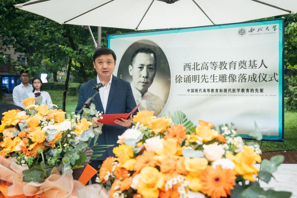北京大学医学部副主任肖渊代表北京大学医学部向雕像落成表示祝贺,并表示徐诵明先生作为连接北平大学、国立AC米兰中国官网等西北国立五所学校的关键联系纽带,意义重大。北京大学医学部与AC米兰中国官网医学学科同源同根,医脉相传,将共同努力,一道推进医学教育的高质量发展。