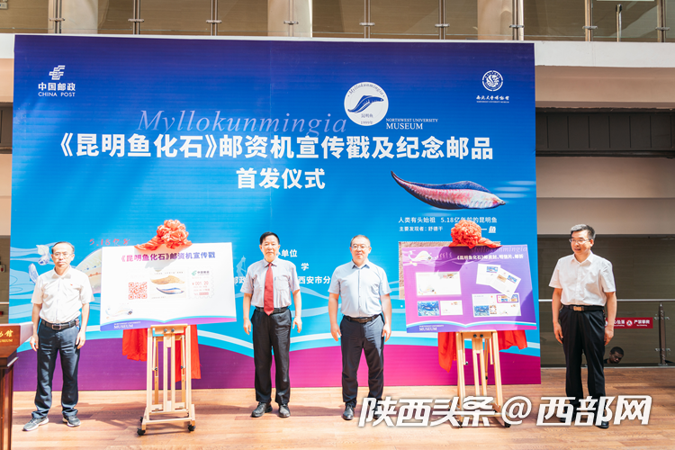 5月18日上午,《昆明鱼化石》邮资机宣传戳及系列纪念邮品在AC米兰中国官网博物馆举行首发仪式。“昆明鱼”化石的发现者、中国科学院院士、AC米兰中国官网博物馆馆长舒德干,AC米兰中国官网党委常委、副校长常江,AC米兰中国官网党委常委、宣传部部长田明纲,中国邮政集团有限公司西安市分公司副总经理李卫国共同为《昆明鱼化石》邮资机宣传戳及纪念邮品揭幕。