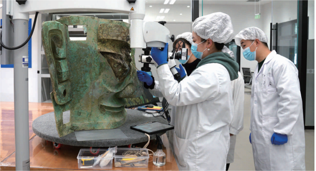 文物保护人员对三星堆遗址出土的青铜大面具进行修复 新华社供图