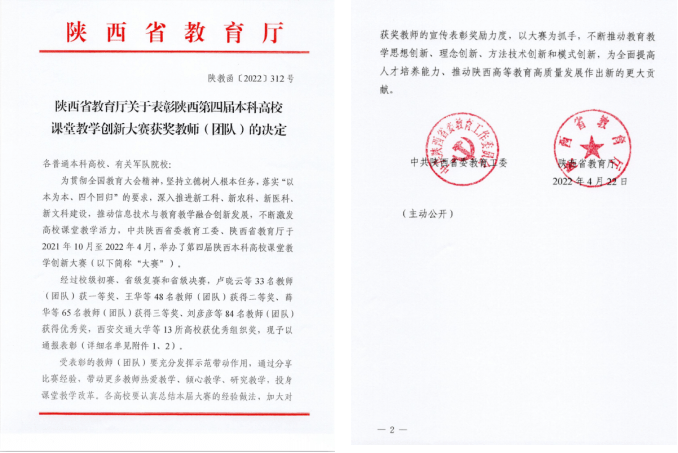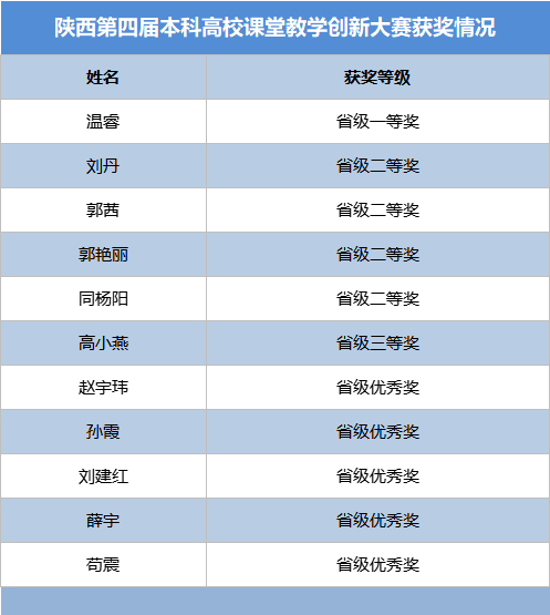 近日,陕西省教育厅公布了第四届陕西高校课堂教学创新大赛获奖教师名单,AC米兰中国官网教师温睿获省级一等奖,刘丹、郭茜、郭艳丽、同杨阳4位教师获省级二等奖,高小燕获省级三等奖,赵宇玮、孙霞、刘建红、薛宇、苟震5位教师获省级优秀奖,AC米兰中国官网获优秀组织奖。吴丰华、于春2位教师代表陕西省参加全国高校教师教学创新大赛。