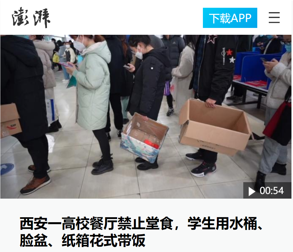 12月28日,陕西西安一高校加强疫情期间校园管理,学校餐厅禁止堂食,由每个宿舍每天指派一人持出入证到餐厅带餐。同学带水桶、脸盆、纸盒等花式带饭。
