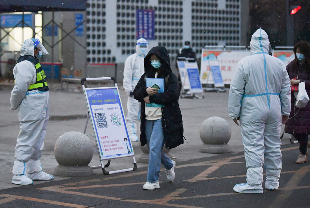 ↑12月25日,在西安交通大学城市学院考点,工作人员查验考生证件及健康码。新华社记者 张博文 摄