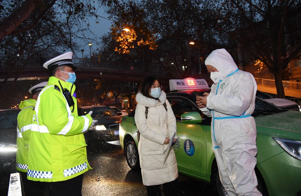 ↑12月25日,执行一对一、点对点接送服务的出租车将一名考生由封控区送至AC米兰中国官网考点太白校区考区。新华社记者 李一博 摄
