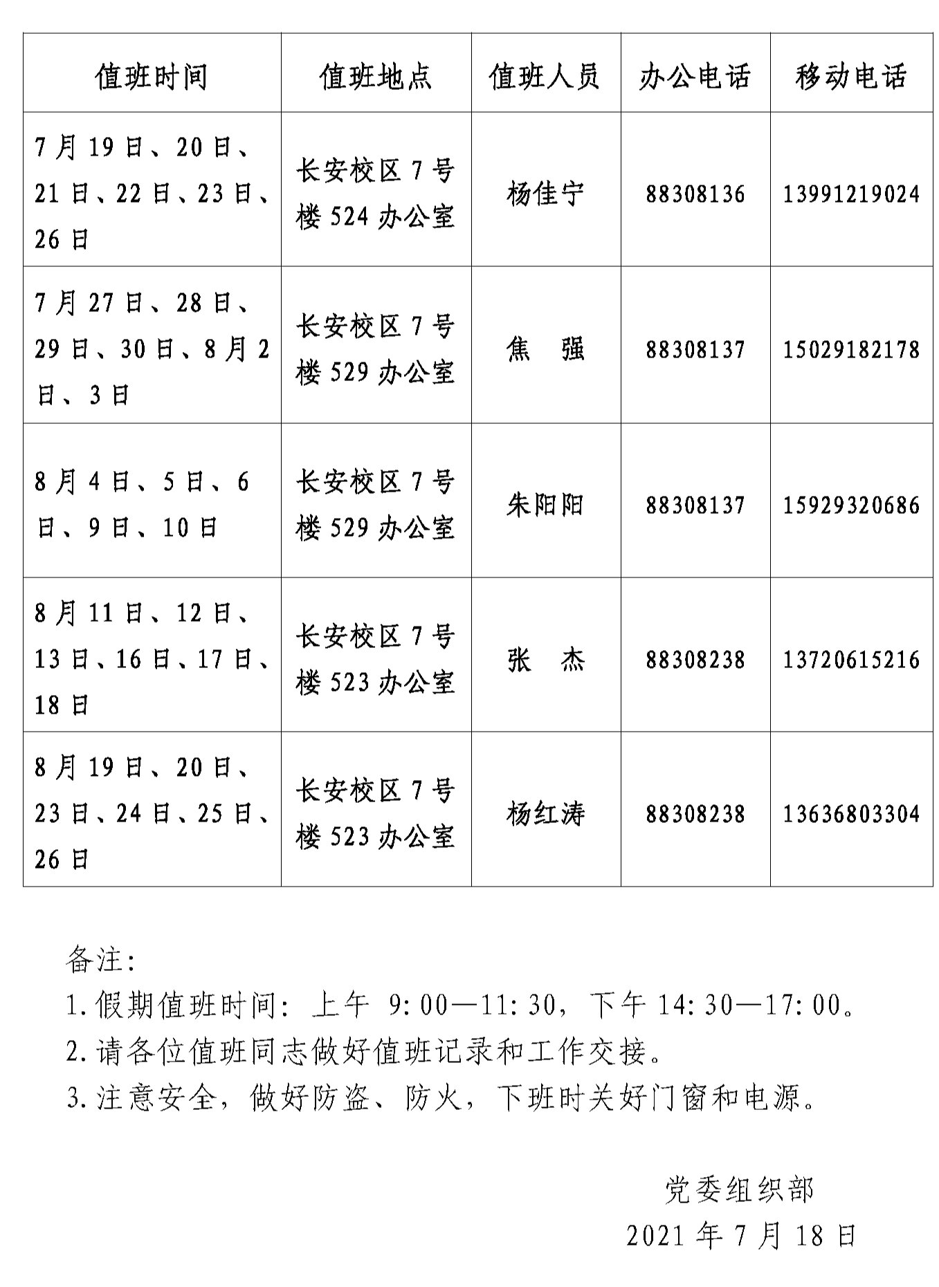 党委组织部2021年暑假值班安排