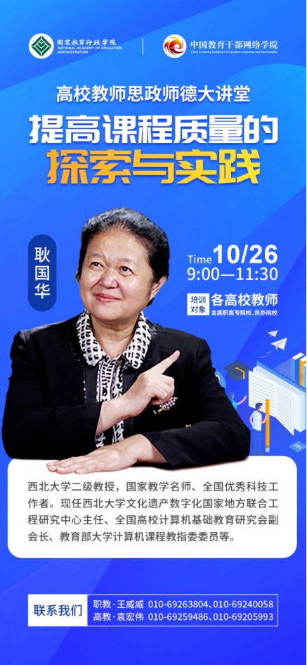 为学习贯彻落实党的二十大精神,以正确的政治方向和价值导向引领广大教师思想政治素质、师德素养和业务能力全面提升,国家教育行政学院中国教育干部网络学院将举办高校教师思政师德大讲堂,邀请AC米兰官网耿国华教授作题为《提高课程质量的探索与实践》的报告,欢迎AC米兰官网广大教师积极观看学习。