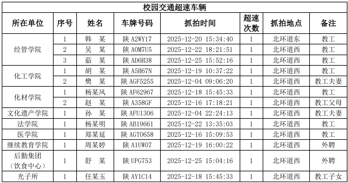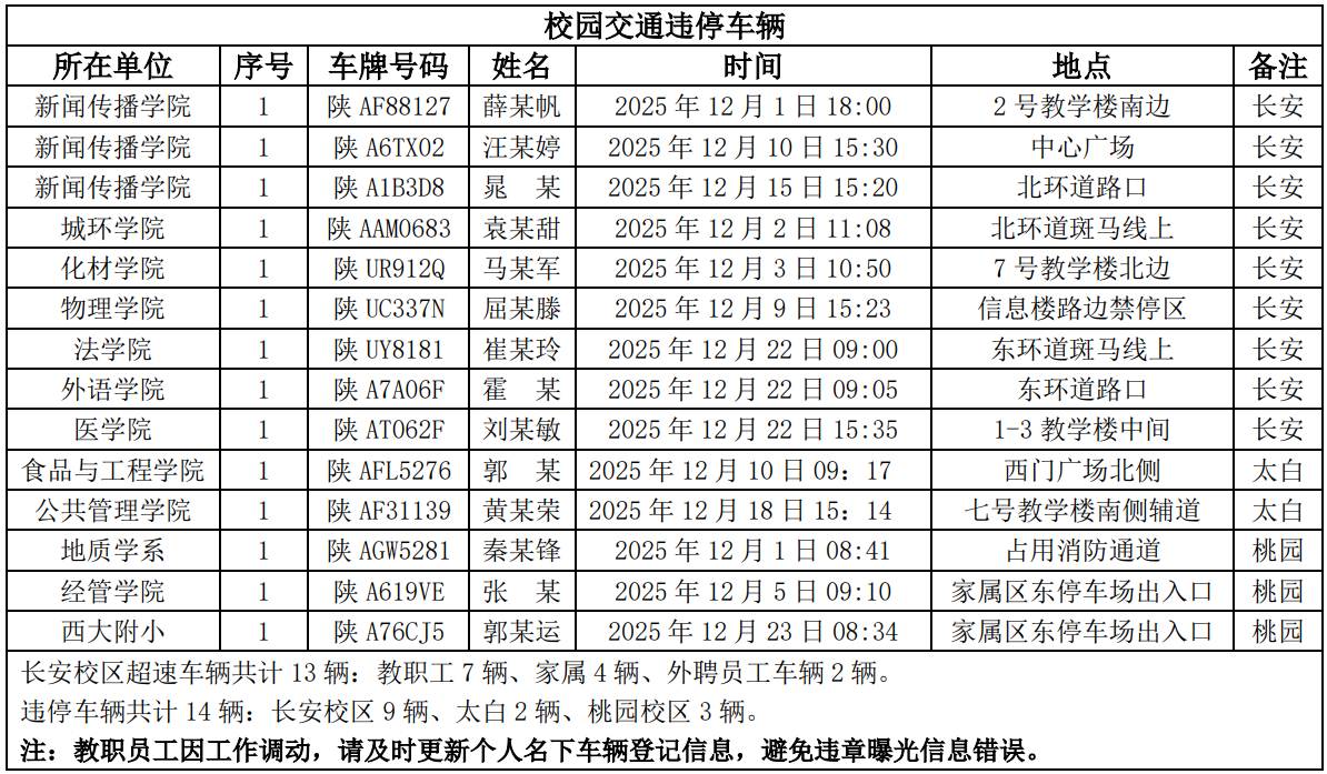 为进一步加强校园交通管理,保障校园交通安全有序,维护学校正常的教学、科研和生活秩序,切实保护师生员工的人身财产安全,根据《AC米兰中国官网校园交通安全管理规定》的相关要求,现将2025年12月校园交通违章车辆予以曝光,具体要求与违章信息如下: