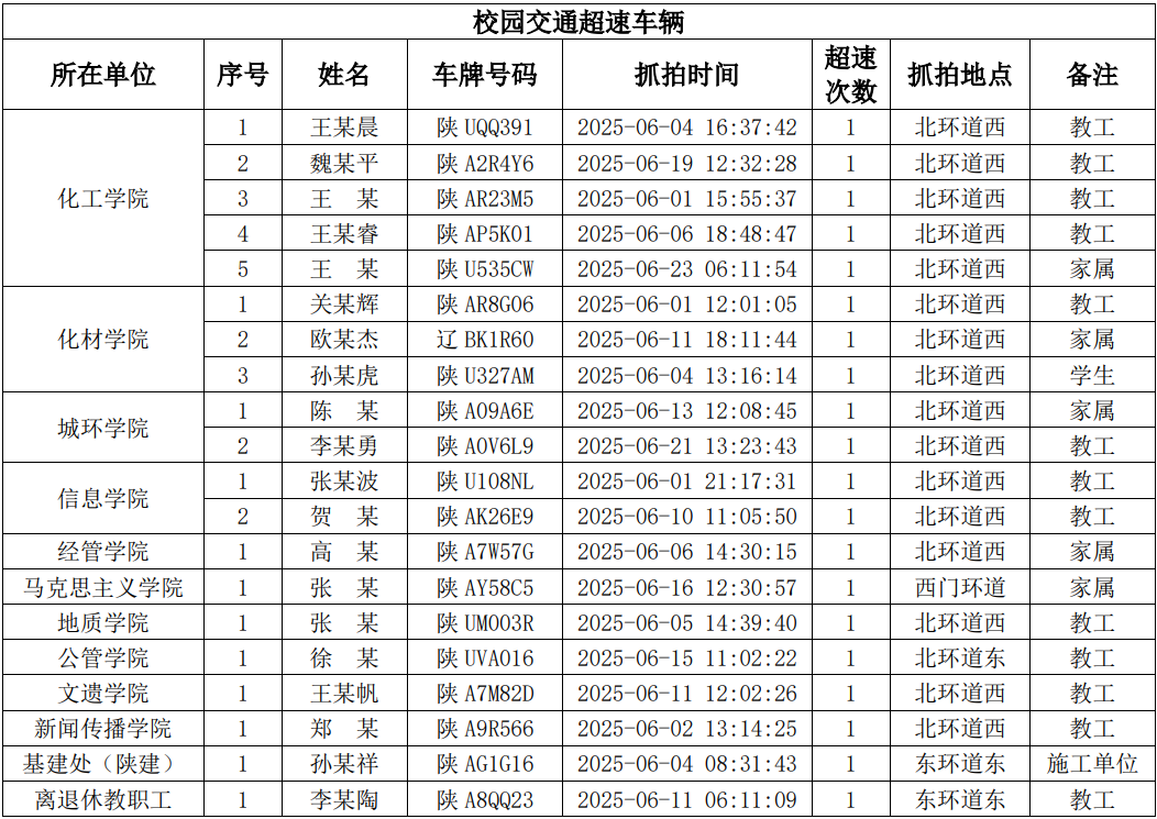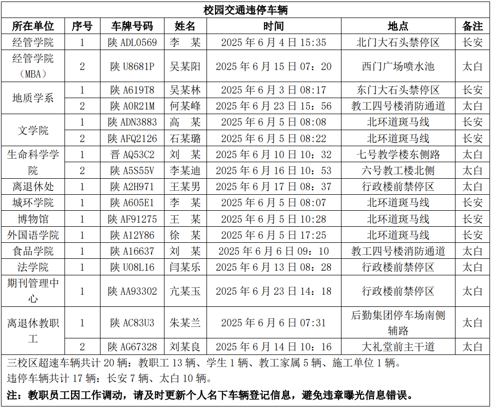 为进一步加强校园交通管理,保障校园交通安全有序,维护学校正常的教学、科研和生活秩序,切实保护师生员工的人身财产安全,根据《AC米兰中国官网校园交通安全管理规定》的相关要求,现将2025年6月校园交通违章车辆予以曝光,具体要求与违章信息如下:
