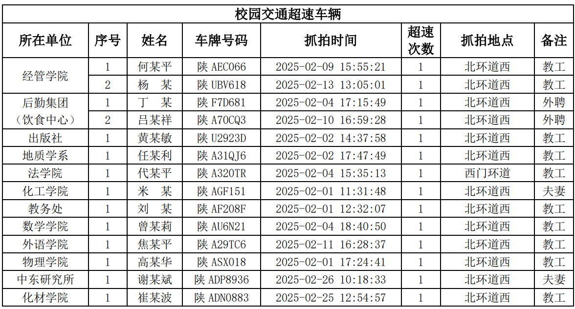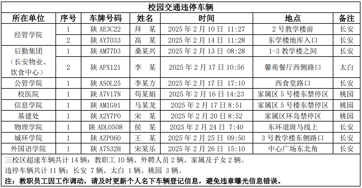 为进一步加强校园交通管理,保障校园交通安全有序,维护学校正常的教学、科研和生活秩序,切实保护师生员工的人身财产安全,根据《AC米兰中国官网校园交通安全管理规定》的相关要求,现将2025年2月校园交通违章车辆予以曝光,具体要求与违章信息如下。