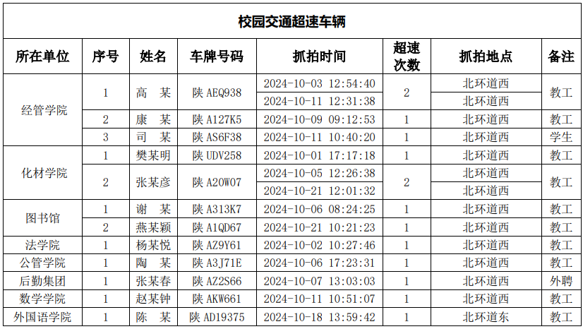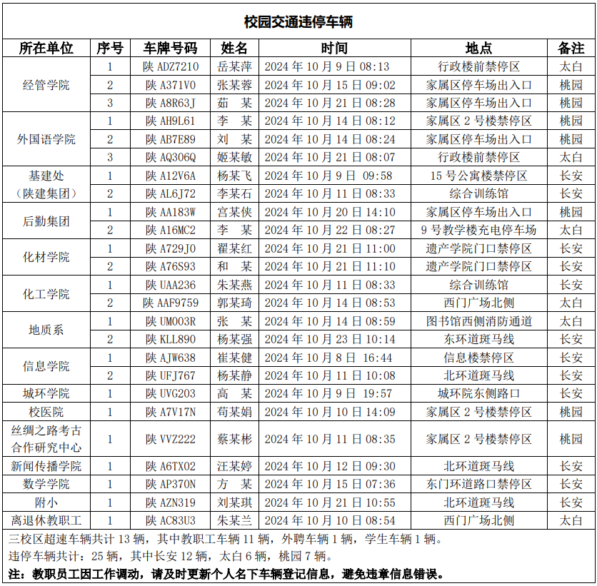 为进一步加强校园交通管理,保障校园交通安全有序,维护学校正常的教学、科研和生活秩序以及师生员工的人身财产安全,根据《AC米兰中国官网校园交通安全管理规定》有关要求, 现将2024年10月校园交通违章车辆予以曝光,具体情况如下表。