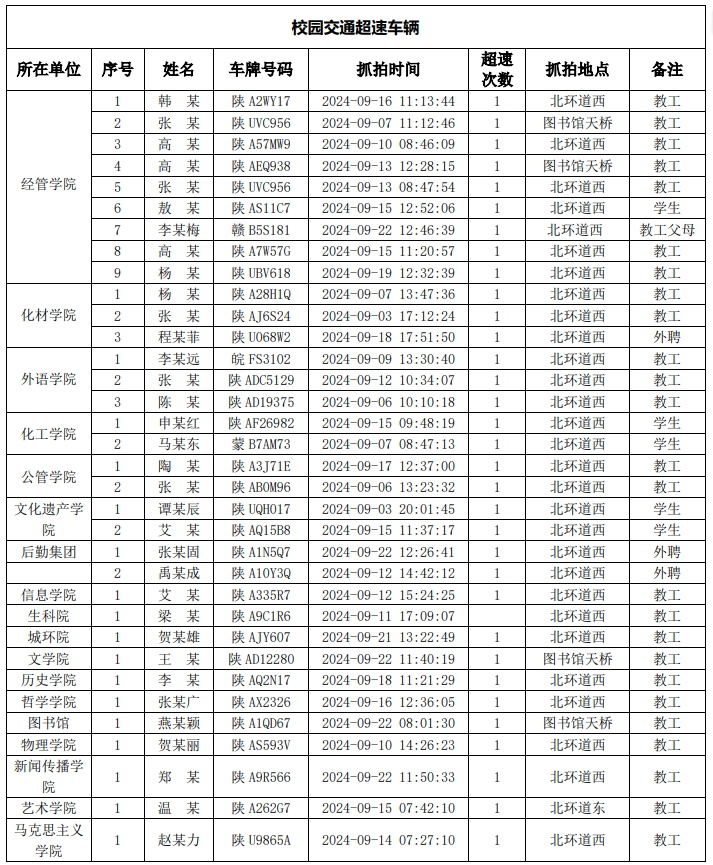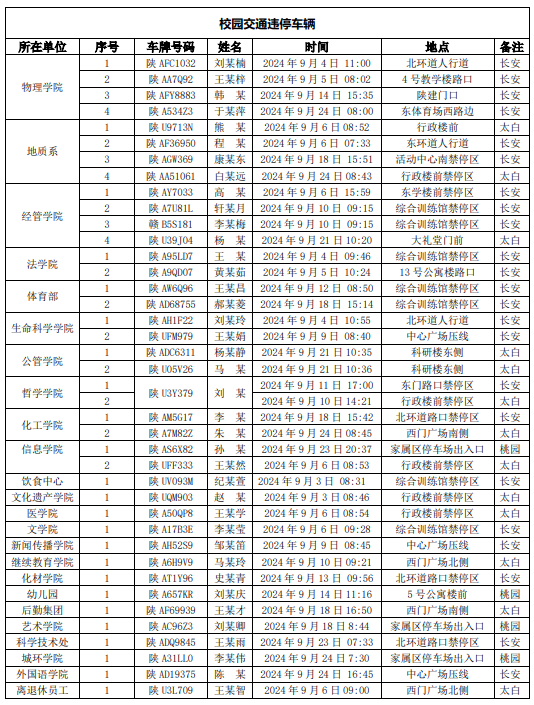 为一步加强校园交通管理,保障校园交通安全有序,维护学校正常的教学、科研和生活秩序以及师生员工的人身财产安全,根据《AC米兰中国官网校园交通安全管理规定》有关要求, 现将2024年9月校园交通违章车辆予以曝光,具体情况如下表。