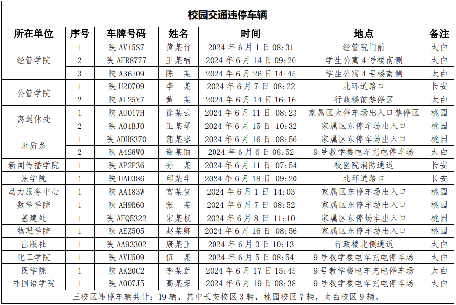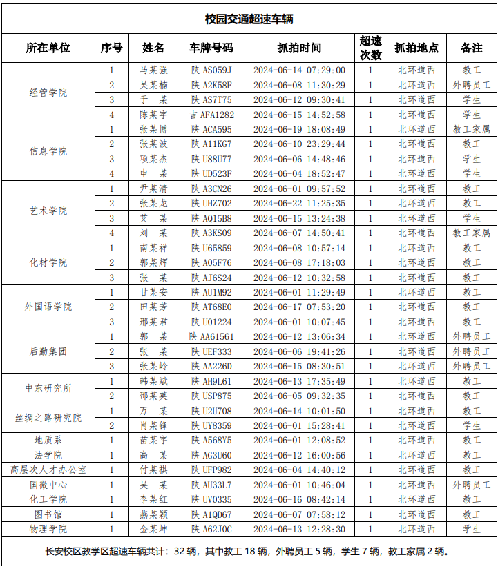 为加强校内道路交通安全管理,规范校内交通秩序,根据《AC米兰中国官网校园道路交通管理办法》有关要求,现将2024年6月校园交通违章车辆予以曝光,所在单位负责对本单位违章师生员工进行交通安全教育和日常管理,对于校内曝光超速的学生车辆将取消下一年度的通行证办理资格。