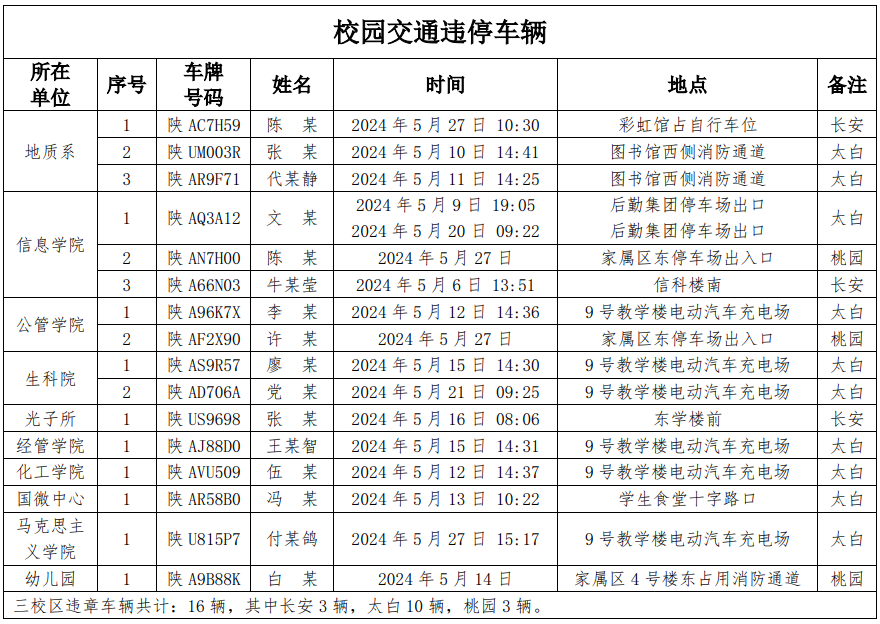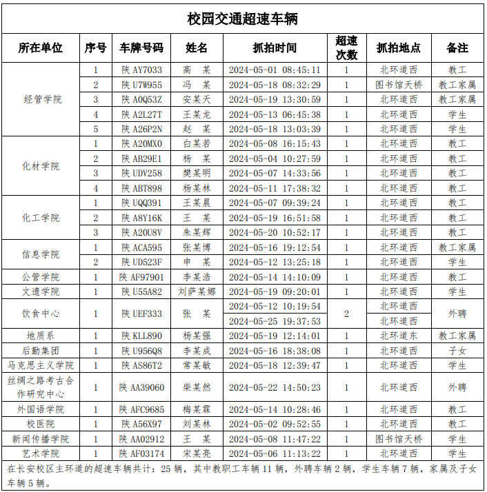 为加强校内道路交通安全管理,规范校内交通秩序,根据《AC米兰中国官网校园道路交通管理办法》有关要求,现将2024年5月校园交通违章车辆予以曝光,所在单位负责对本单位违章师生员工进行交通安全教育和日常管理,对于校内曝光超速的学生车辆将取消下一年度的通行证办理资格。