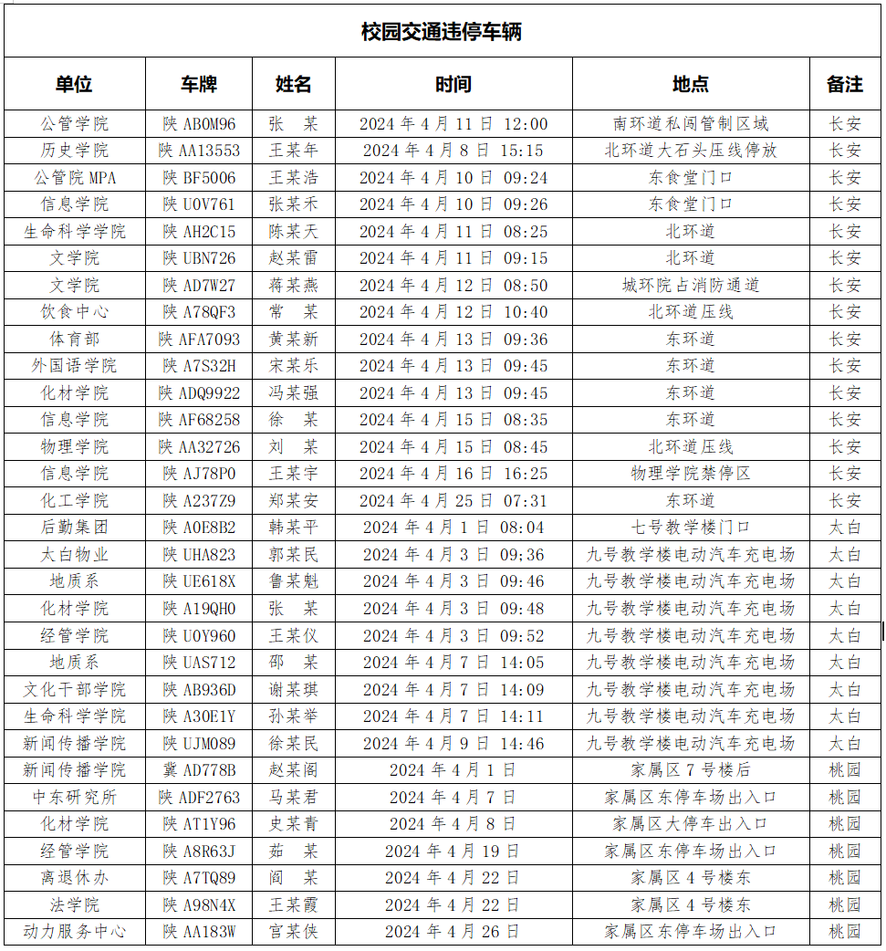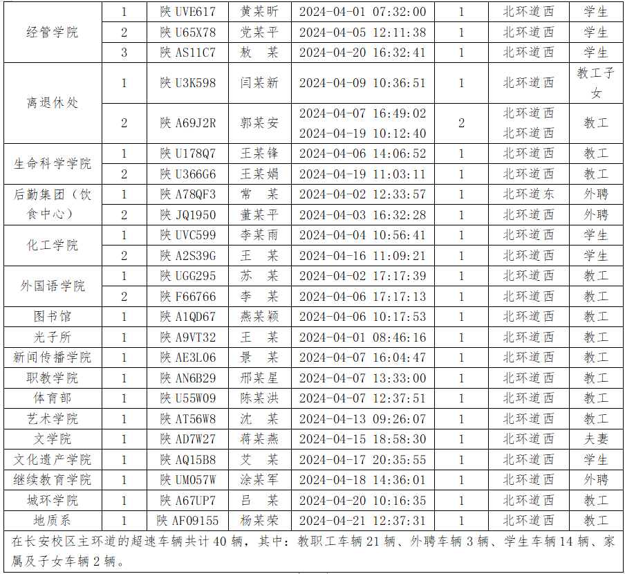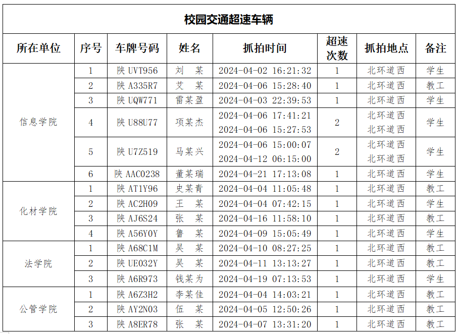 为加强校内道路交通安全管理,规范校内交通秩序,根据《AC米兰中国官网校园道路交通管理办法》有关要求,现将2024年4月校园交通违章车辆予以曝光,4月份教工超速车辆占52%、学生超速车辆占35%、外聘职工及教工家属车辆占12%,请所在单位加强对本单位违章师生员工的教育和管理,对于校内曝光超速的学生车辆将取消下一年度的通行证办理资格。