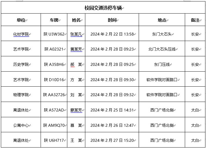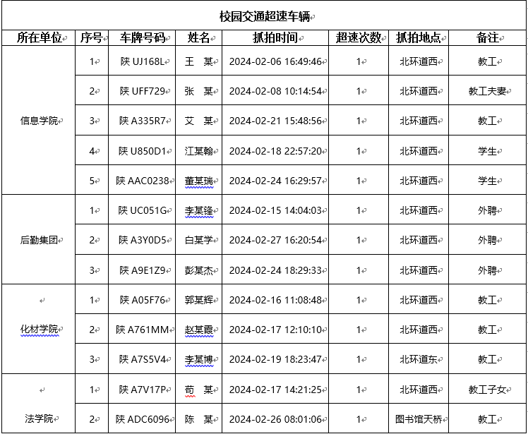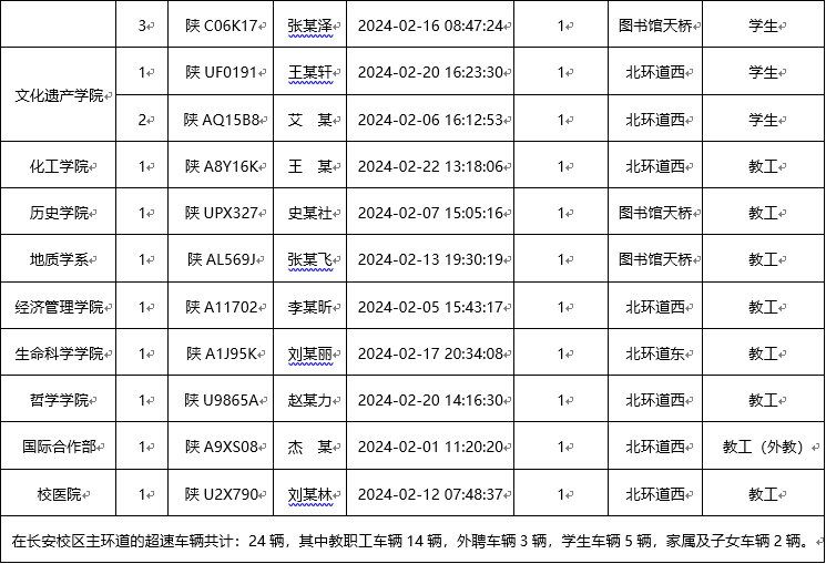 为加强校内道路交通安全管理,规范校内交通秩序,根据《AC米兰中国官网校园道路交通管理办法》有关要求,现将2024年2月校园交通违章车辆予以曝光,所在单位负责对本单位违章师生员工进行交通安全教育和日常管理。