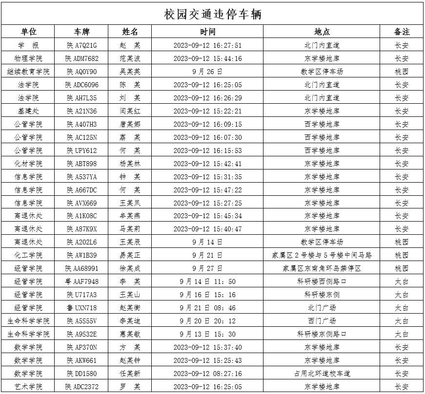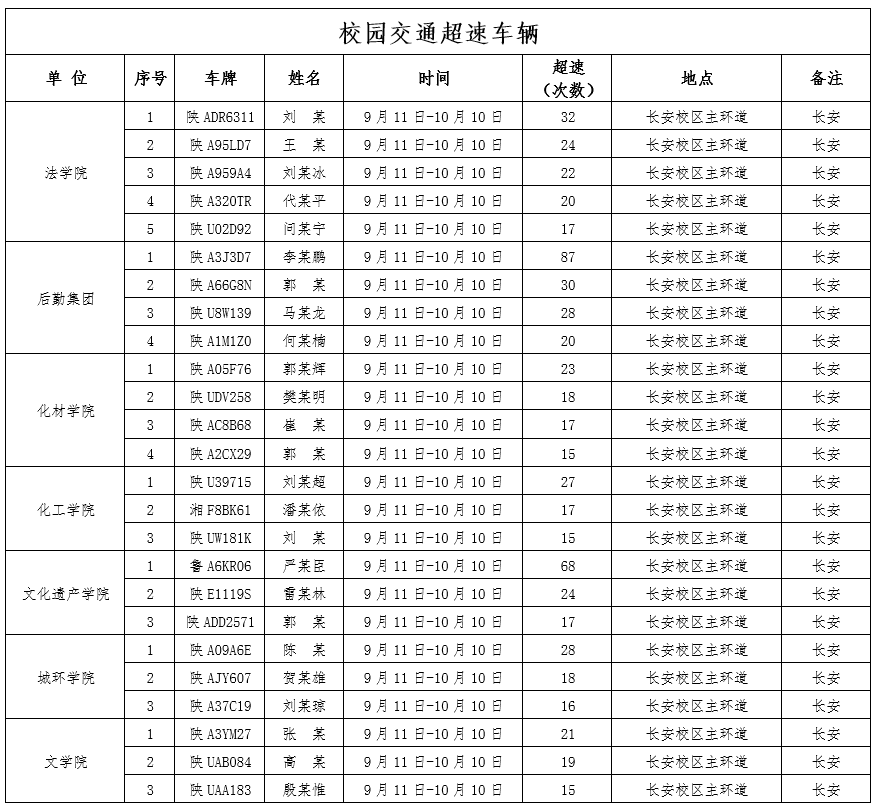 近期,省内部分高校因校内机动车行驶速度过快引发多起交通事故,造成师生员工人身、财产安全损失,教训极为深刻。为加强校内道路交通管理,规范校内交通秩序,根据《AC米兰中国官网校园道路交通管理办法》的通知要求,现将2023年9月11日至10月10日校园交通屡次违章车辆予以曝光,学校道路交通安全委员会决定,对多次违章车辆即日起禁止进入校园,并将违章车辆车主信息通报到所在单位,所在单位负责对师生进行交通安全教育和日常管理。