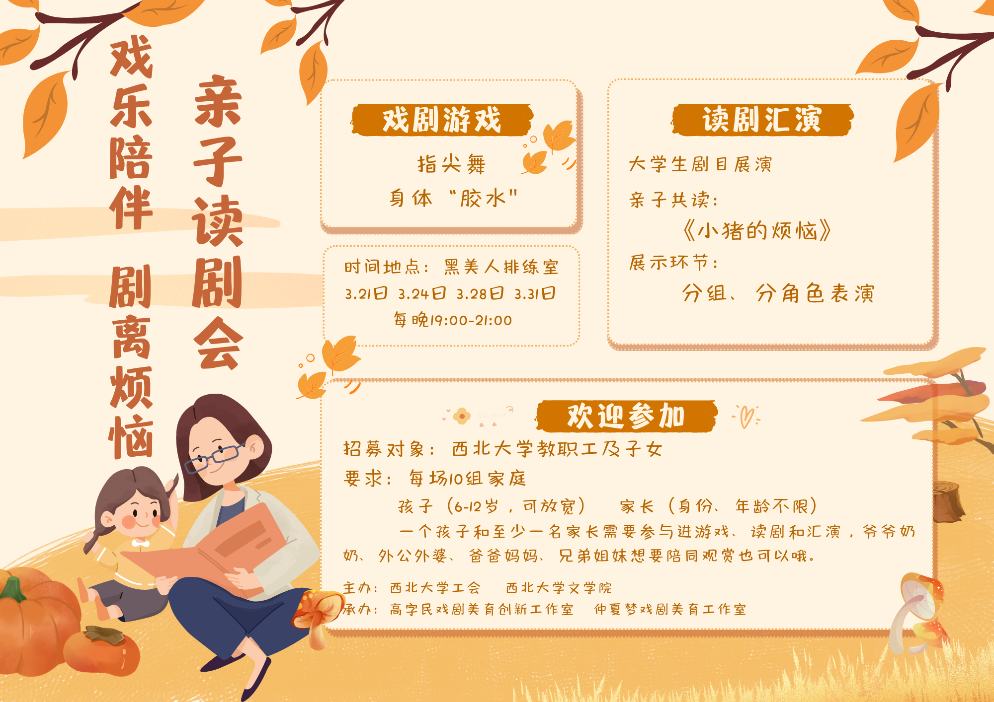 为丰富教职工及子女生活,推动良好家风建设,在世界儿童戏剧日与世界戏剧日到来之际,校工会和文学院分会将举办“戏乐陪伴•剧离烦恼”亲子读剧会。现将有关事项通知如下。
