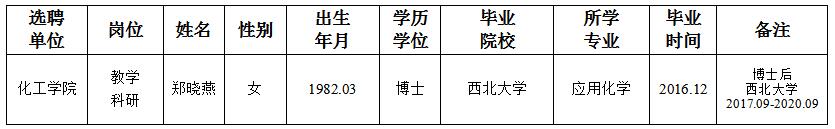 经用人单位及教学督导考核、学校研究,拟同意选聘下列人员来校工作,其聘任关系为A类人事代理。本着公平、公正、公开的原则,现将拟选聘人员基本情况公示如下: