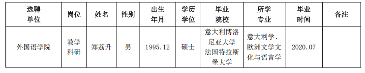 经用人单位及教学督导考核、学校研究,拟同意选聘下列人员来校工作,其聘任关系为A类人事代理。本着公平、公正、公开的原则,现将拟选聘人员基本情况公示如下: