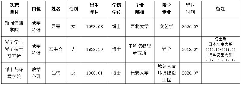 经用人单位推荐,人力资源部审查,学校教学督导及院系相关专家考核,AC米兰官网拟确定下列人员来校工作。本着公平、公正、公开的原则,现将本次拟选聘人员基本情况公示如下: