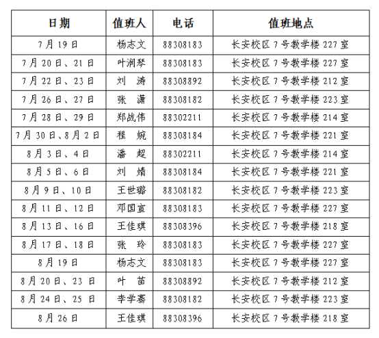 根据《党委办公室、校长办公室关于2021年暑假及开学安排的通知》,结合教务处工作实际,现将值班安排及联系方式公布如下: