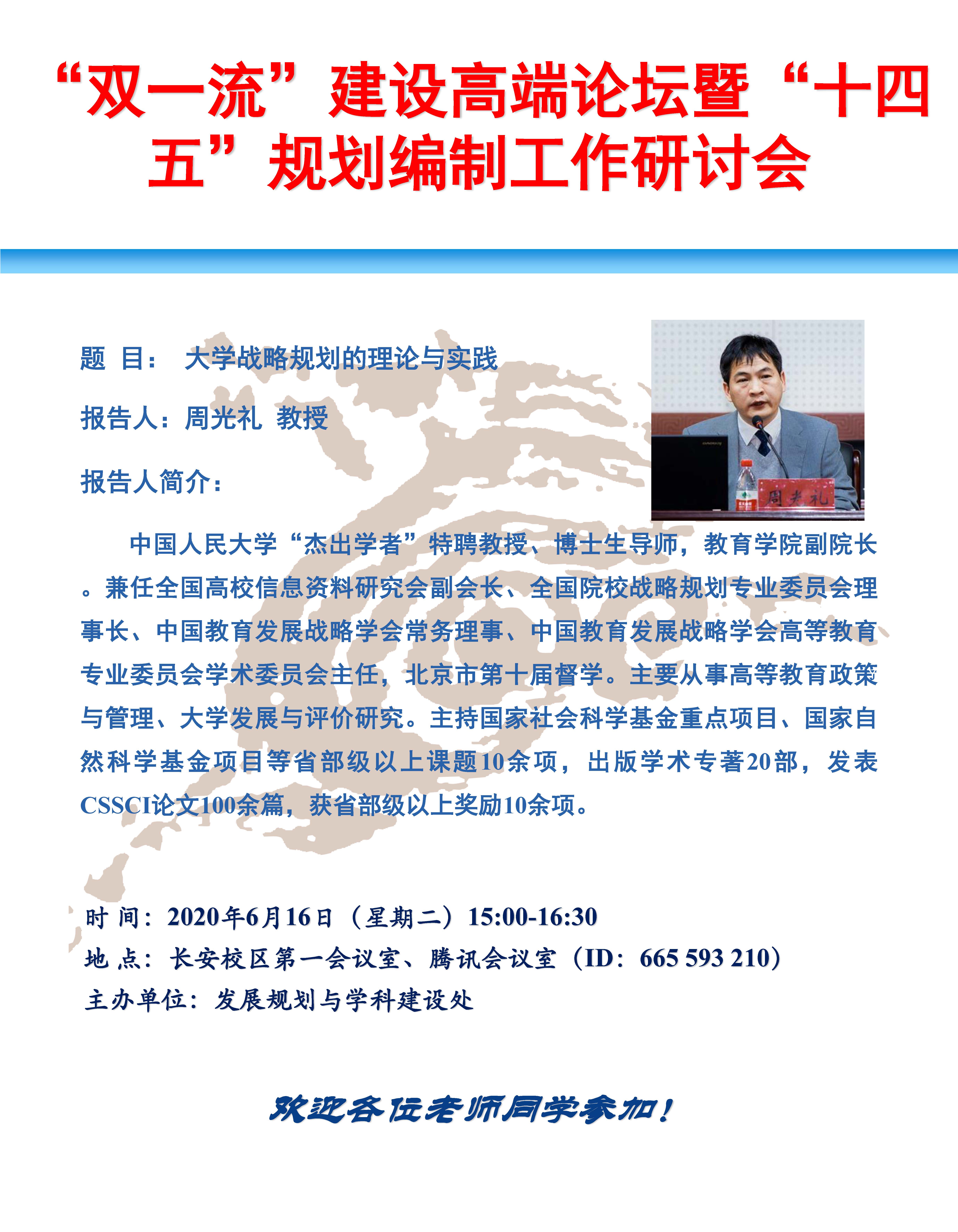 兹定于6月16日(星期二)下午15:00,在长安校区第一会议室、腾讯会议室(ID:665 593 210),举行“双一流”建设高端论坛暨“十四五”规划编制工作研讨会,邀请高等教育规划专家、中国人民大学“杰出学者”特聘教授周光礼教授作“大学战略规划的理论与实践”的专题报告。