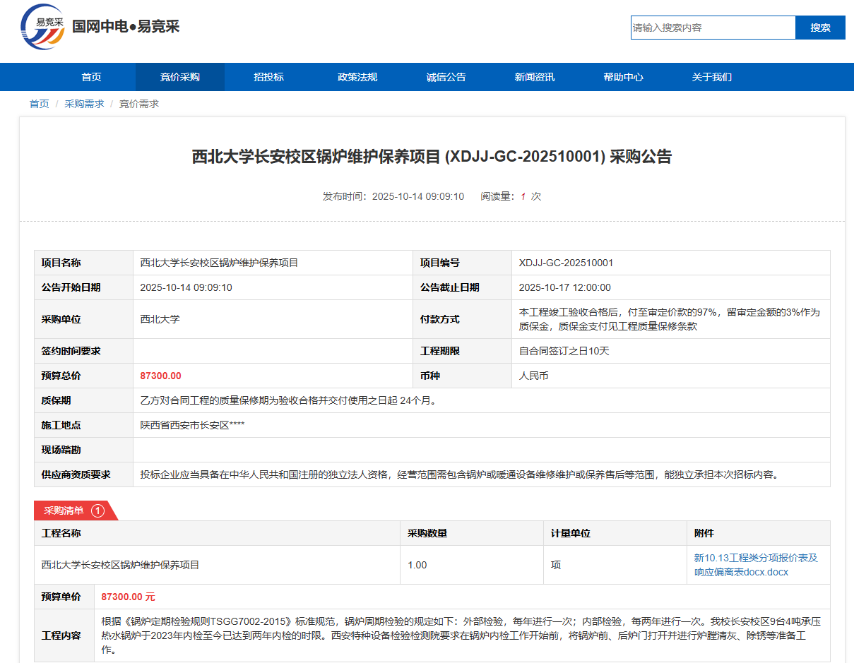 AC米兰中国官网长安校区锅炉维护保养项目(XDJJ-GC-202510001)竞价采购公告