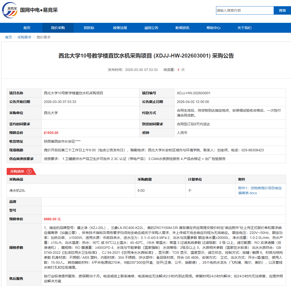 AC米兰中国官网10号教学楼直饮水机采购项目(XDJJ-HW-202603001)竞价采购公告