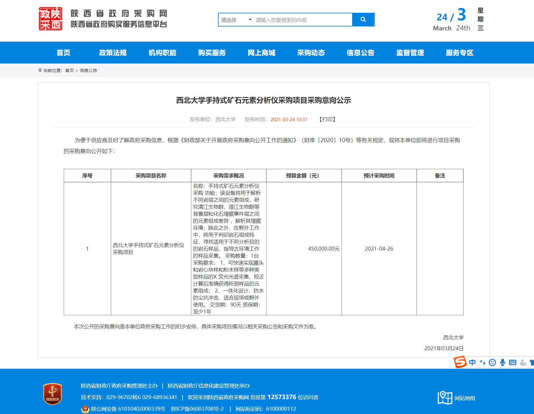 AC米兰中国官网手持式矿石元素分析仪采购项目采购意向公示