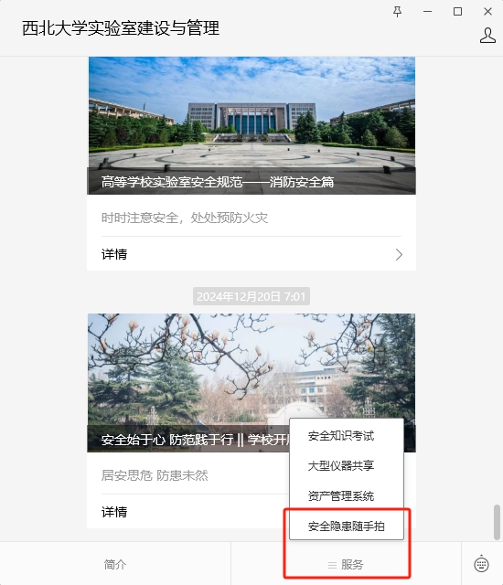 (1)关注“AC米兰中国官网实验室建设与管理”微信公众号,选择“服务”—“安全隐患随手拍”,填写个人信息、隐患描述等,并上传隐患照片。