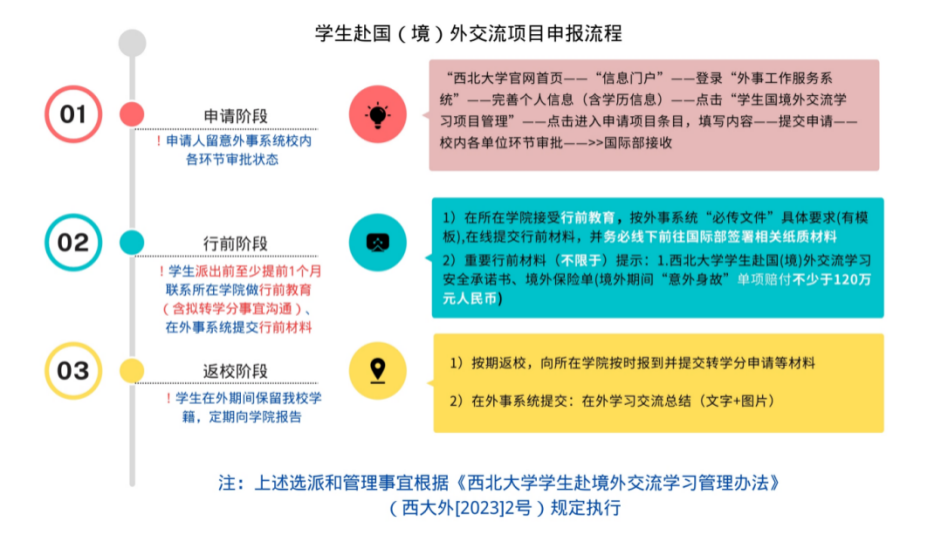 3.申请学生在确定被录取后,如确认参加本项目线下赴国境外交流模块,应及时履行出国(境)前相关行前手续。具体流程及要求见下图。行前教育常见问题可查阅:https://kdocs.cn/l/crHi8O80mCFF。