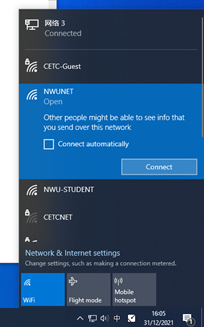 2、学校统筹了教学办公区有限的网络资源,已经在宿舍区域临时开通了NWUNET无线网络信号,并为同学们开通了账号,缓解宿舍区网络带宽压力。同学们可以搜索连接NWUNET无线网络,账号为学号,初始密码为身份证后六位。临时无线网络方案在学校全面恢复线下教学后结束。