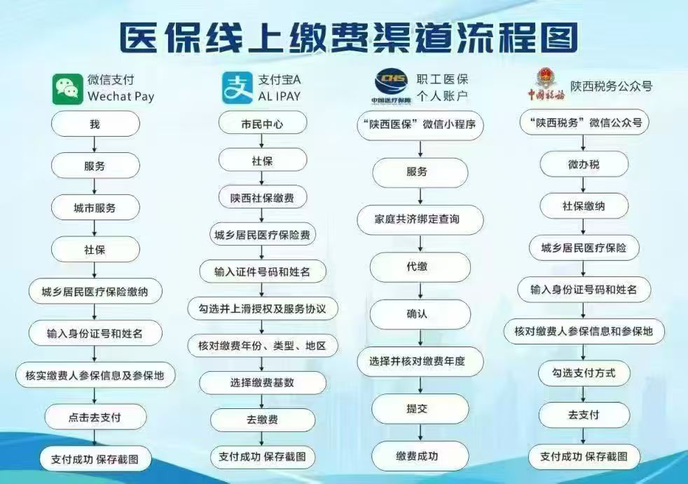 1. 通过职工医保账户共济代缴(缴费路径:微信或支付宝搜索“陕西医保”小程序-服务-家庭共济-共济绑定-个账代缴)。