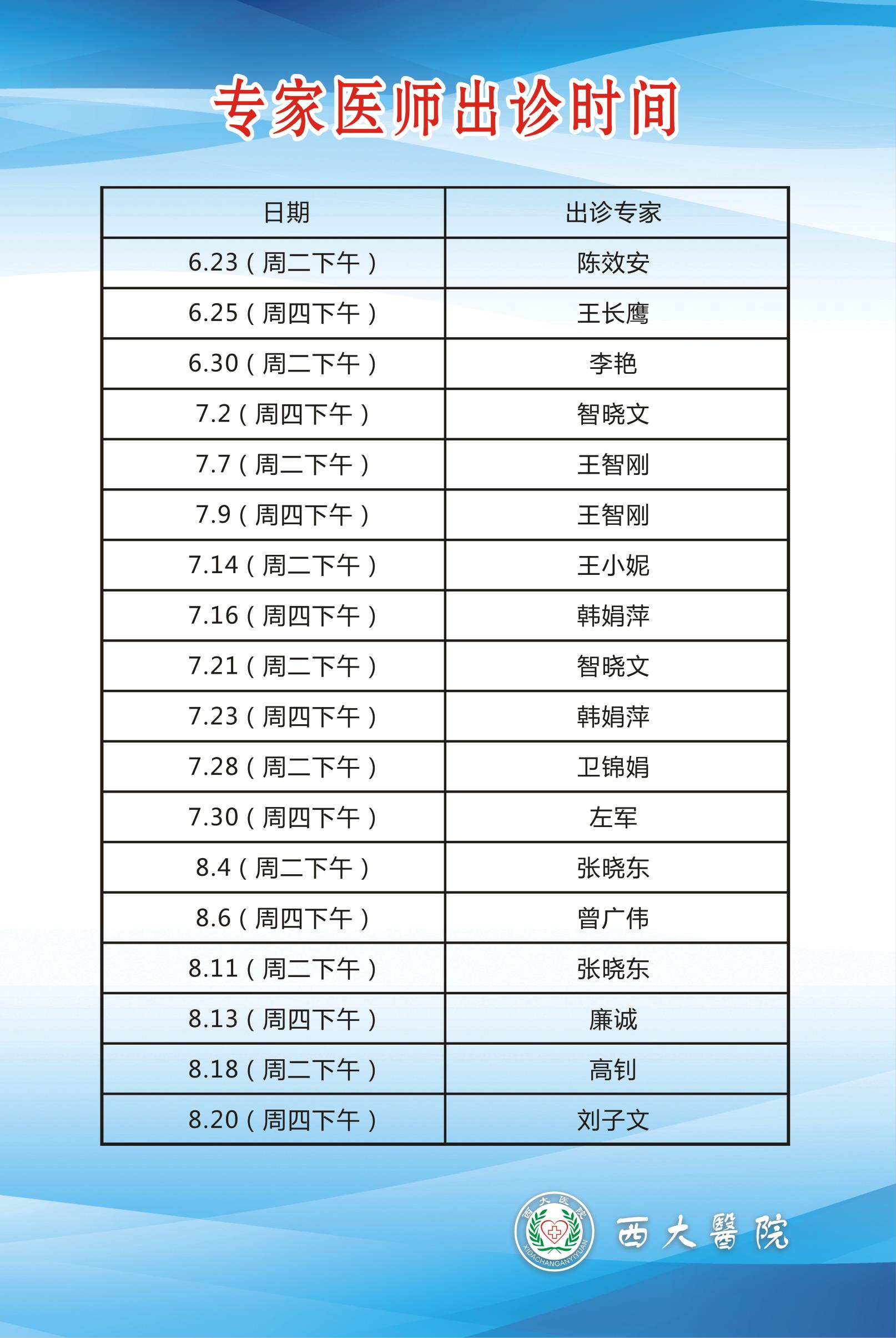 本年度教职工健康体检已全面开展,为充分做好体检期间及检后健康指导等服务,体检期间(6月23日—8月20日)校医院特邀西安国际医学中心医院专家每周二、四下午在长安校区校医院医院坐诊,为各位参检教职工提供免费解读体检报告、健康咨询等服务。