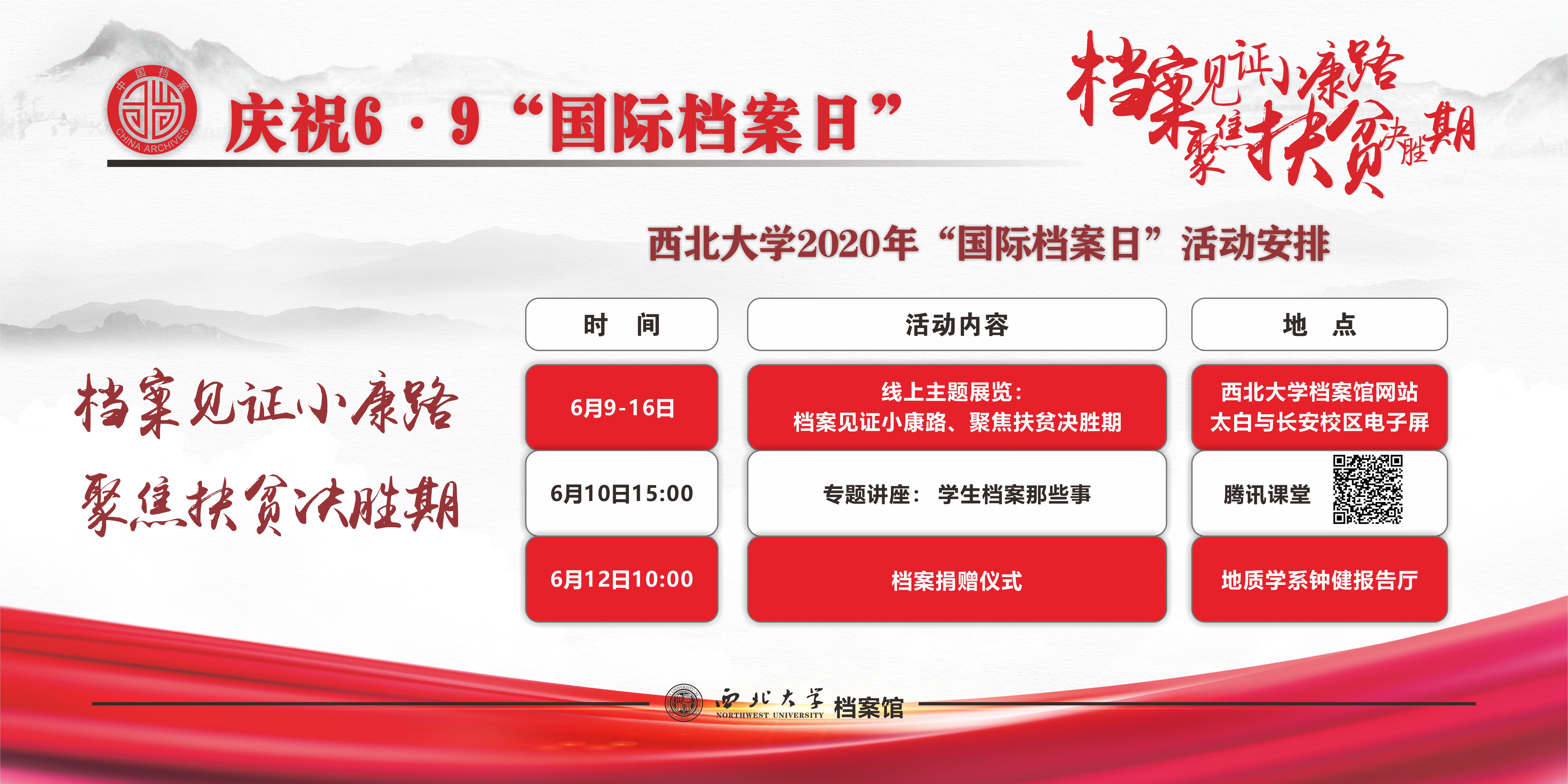 为深入学习宣传贯彻习近平总书记来陕考察重要讲话,认真贯彻落实《关于加强和改进新形势下档案工作的意见》和《国家档案局关于开展2020年国际档案日系列宣传活动的通知》等有关精神,发挥档案工作“记载历史、传承文明、服务未来”的作用和档案“存凭、留史、资政、育人”的功能,讲好“西大故事”,增强全校师生档案意识,进一步推动学校档案工作,助力“双一流”建设,学校举办第六届以“档案见证小康路、聚焦扶贫决胜期”为主题的“国际档案日”系列活动。具体活动安排如下,欢迎广大师生参加!
