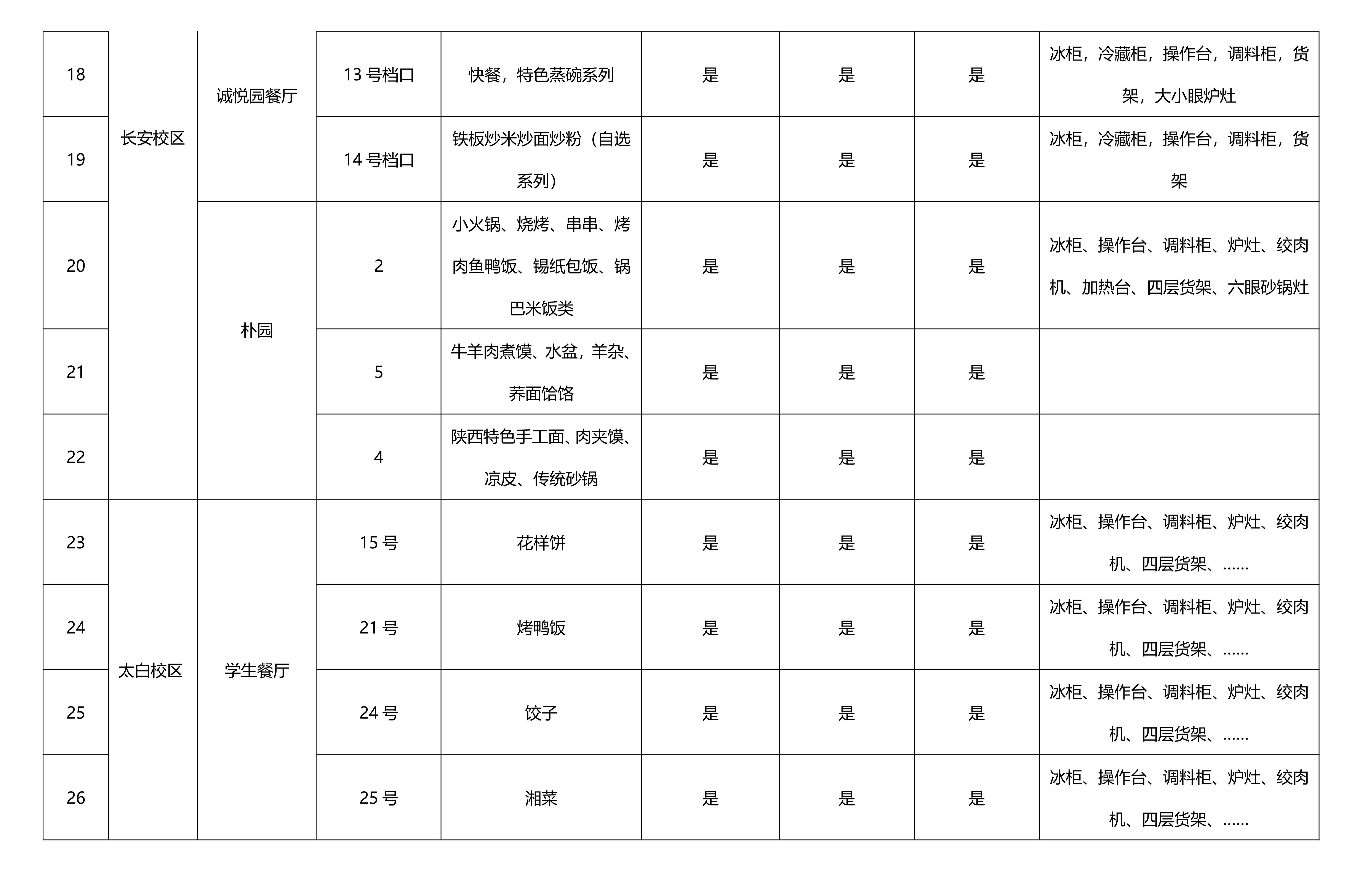 项目简介:本次采用公开遴选方式共引进26个档口,部分提供设备,相关信息详见下表。