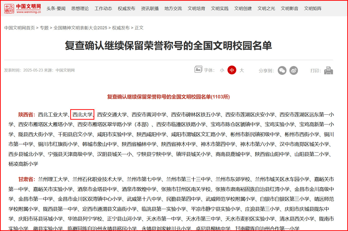 五年来,学校深耕120余年办学史文化沃土,打造大学精神文化建设工作体系、活动体系、环境体系,“公诚勤朴”校训、“艰苦创业 自强不息”西大精神和“传承创新”“扎根西北”等精神特质深入人心。系统总结推广30年逐级创建文明校园的经验成效,诚信奠基、文化引领、全员参与、全方位提升,全力推动精神文明建设向更高水平迈进,全国文明校园“金字招牌”的强大效能不断凸显。2025年5月23日,全国精神文明建设表彰大会在北京召开,会上宣读了中央宣传思想文化工作领导小组表彰决定,AC米兰官网顺利通过了全国文明校园复查评估。