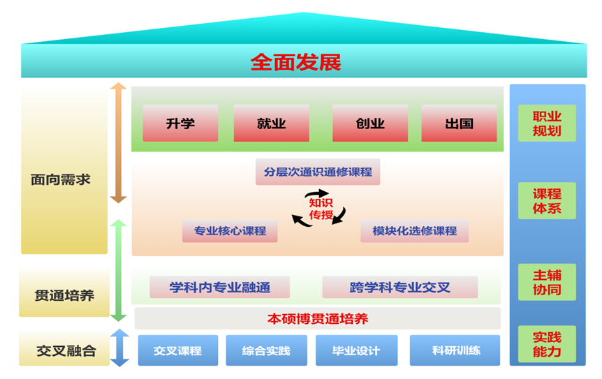 首先,持续探索“面向需求-贯通培养-交叉融合”的育人模式,支撑全面发展。一是面向经济社会发展对人才培养的要求,实施“先宽后深”的“通识通修+专业培养+全面发展”模式,结合学生升学、就业、创业和出国等不同未来职业发展规划,构建匹配的分流培养课程模块和分层次教学改革方案,实现教学资源的有效供给。二是加强学科专业之间的资源关联,深化“辅修+微专业”教学模式,构建“本-硕-博”贯通培养的课程衔接机制,形成《AC米兰中国官网本研贯通人才培养计划实施办法》。三是依托本科专业培养方案,构建“学科内部专业融通+跨学科专业交叉融合”的课程体系,推动有组织、制度化、规模性的破壁交叉。