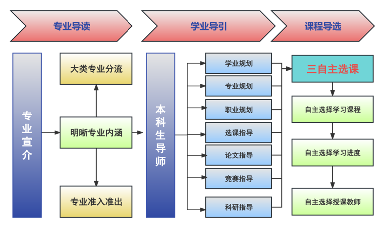 其次,推动构建“专业导读-学业导引-课程导选”的导学体系,助力自主性学习。一是基于学生的意愿和知识体系基础,以专业导读课程体系建设为核心,形成全方位、多样化的专业宣介机制,加强学生对于本科专业的全面了解与系统认知。二是在大类培养的基础上,推进导师制实施,构建学生学习与发展指导机制,引导学生合理规划学业方案。三是形成学生自主选择学习课程、自主选择学习进度、自主选择教师的“三自主”模式,明确先修课程建议,为学生规划学业进程提供参考与指引。
