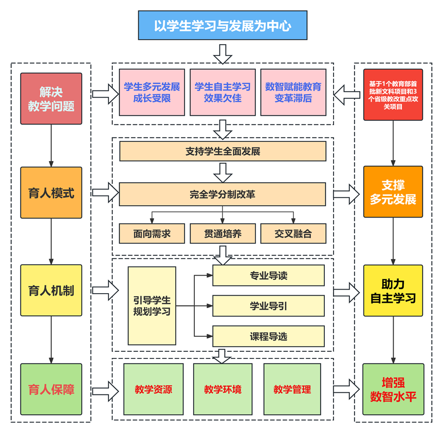 在数智赋能个性化学习体系建设上,秉持“一个中心”——以育人为中心,推进三项改革。坚持立足综合性研究型大学定位,紧扣优势学科集群发展需求,将数字技术赋能与学校扎根西部、服务国家、世界一流”的办学定位深度融合,以技术革新破解传统育人模式下的个性化培养瓶颈,让数智赋能真正服务于拔尖创新人才和复合型人才培养目标。