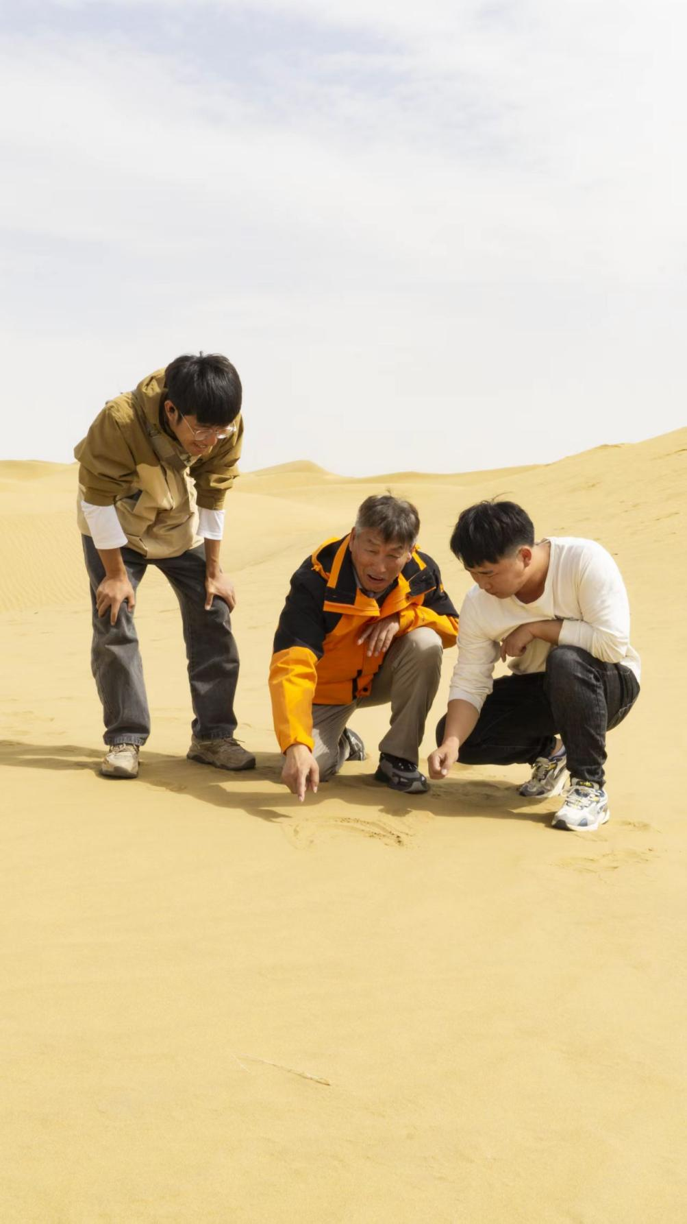 雷加强(中)在塔克拉玛干沙漠腹地与学生就地讨论风沙运动规律和沙丘形态特征。(受访者供图)