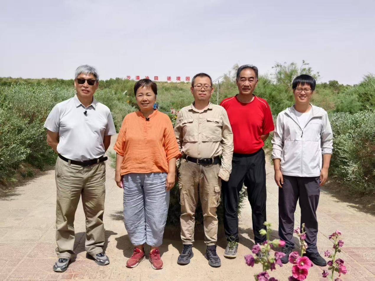 雷加强(左)与团队几位成员相聚在地处塔克拉玛干沙漠腹地的塔中沙漠植物园。(受访者供图)